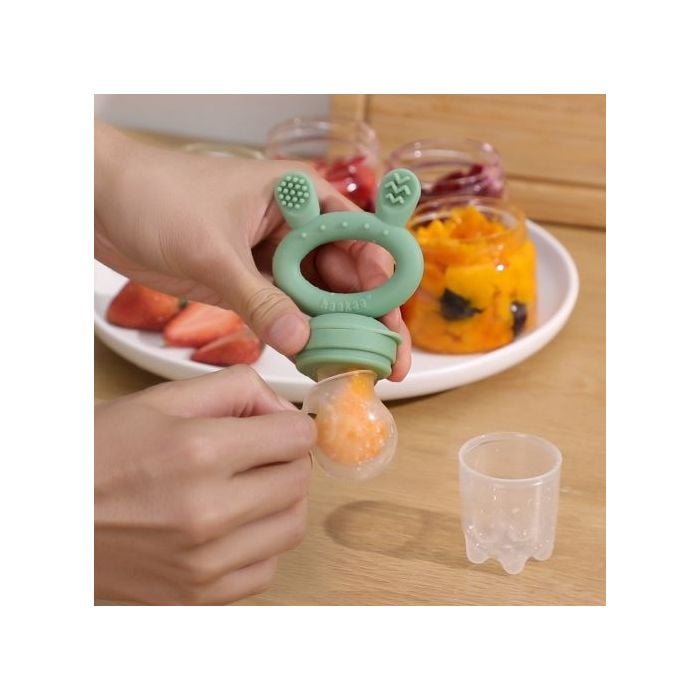 Podajalnik za svežo hrano operite pred in po vsaki uporabi. Čeprav je primerno za pomivanje v pomivalnem stroju, priporočamo pranje v topli vodi z milnico. Za sterilizacijo ali čiščenje tega izdelka ne uporabljajte čistil ali tablet na osnovi belila. Za sterilizacijo uporabite parni sterilizator ali prevrite v vodi 2-3 minute. Silikon lahko absorbira barve živil, s katerimi pride v stik, zato operite takoj po uporabi.
